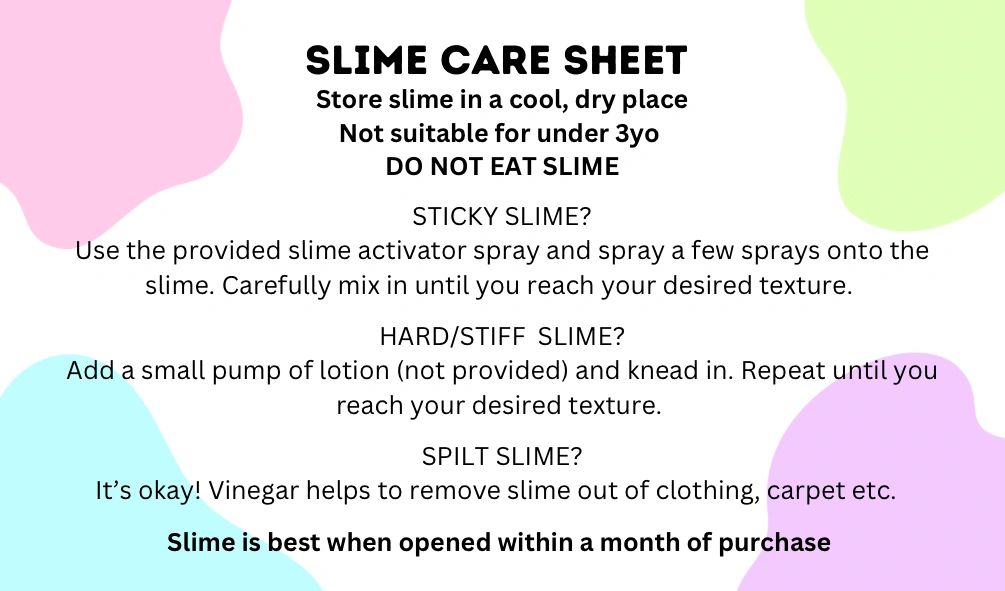 Unfortunately, slime naturally gets sticky over time, especially in hot weather, but don't worry, it can be fixed. If your slime is sticky, spray some of the provided slime activator spray onto the slime and mix. Repeat this until you reach your desired texture. There is a slime activator spray bottle provided with each purchase and large bottles can be requested in special instructions.